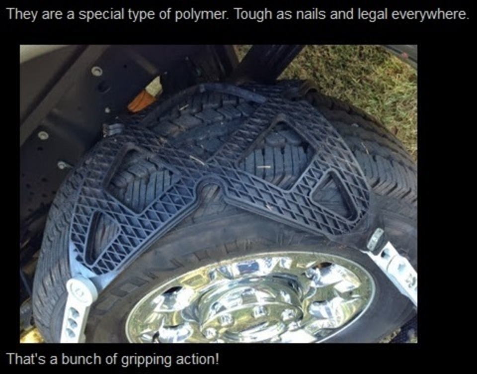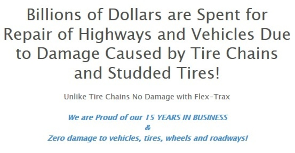 Flex-Trax is designed with a Special Proprietary Polymer Rubber which resist elongation with excellent rebound memory. Said materials that are abrasion resistant, split / tear / cut resistant, cold stress cracking resistant, UV and Mold resistant. (We have hit the unit with a 20 Lb sledge hammer at -40F without even a dent.) Our materials are designed to provide excellent frictional adhesion when needed, without suffering premature failure from abrasive wear. (We have tested to over 800 miles on hot dry pavement with negligible wear.) * The traction pads become softer once exposed to dry pavement use resulting in a smoother ride, and become harder to bite into snow and snow-packed ice once exposed to these conditions. Clients that have properly cleaned and stored our product have reported an average service life of 6-8 years. This Inventor asked the question, "If metal is a good traction material for highway service, why then are tires not made of steel?"